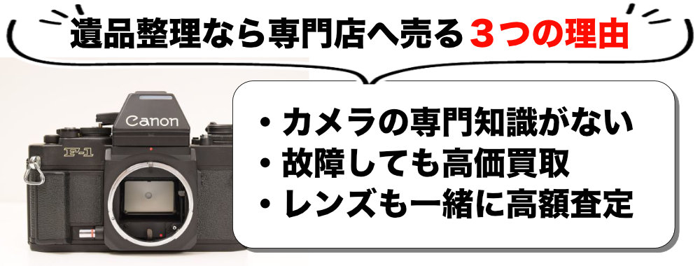 遺品整理の際は、カメラ本体だけでなく、一緒に保管されているレンズ・アクセサリー・箱なども必ず専門店に見せてください。思わぬ高額査定になる可能性があります。