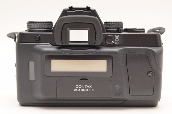 オプションのデータバックD-9を装着したバージョン。D-9は露出データ(シャッター速度・絞り値・露出モード・露出補正値)をフィルム先頭2コマまたはコマ間に集約記録できる多機能型で、インターバル撮影機能も搭載。データバックは「聖杯」的アクセサリーとされるほど希少で、D-9付属個体は査定額が大幅アップします。