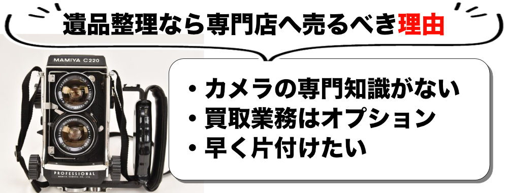 遺品整理でカメラが出てきた場合、まずはカメラ専門の買取店に相談することを強くお勧めします。