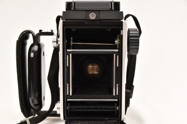 120フィルムで12枚、220フィルムで24枚の6×6cm判画像を撮影可能。フィルム送りは直線式で、他の多くの二眼レフのようにフィルムを曲げて送る方式ではないため、フィルムの平面性が高く、ピント精度の向上に寄与します。