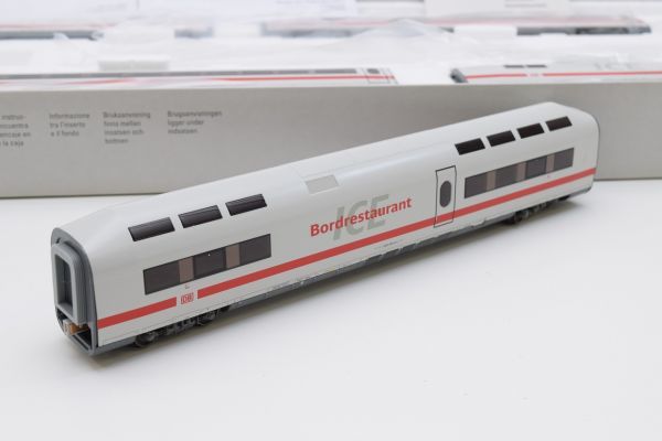 本製品は5両セットですが、別売の43704追加車両セット(3両)を組み合わせることで、8両編成に拡張できます。実車のICE 1は通常12両編成ですが、モデルでは5両または8両という選択肢を提供し、レイアウトスペースに応じた運用が可能です。
