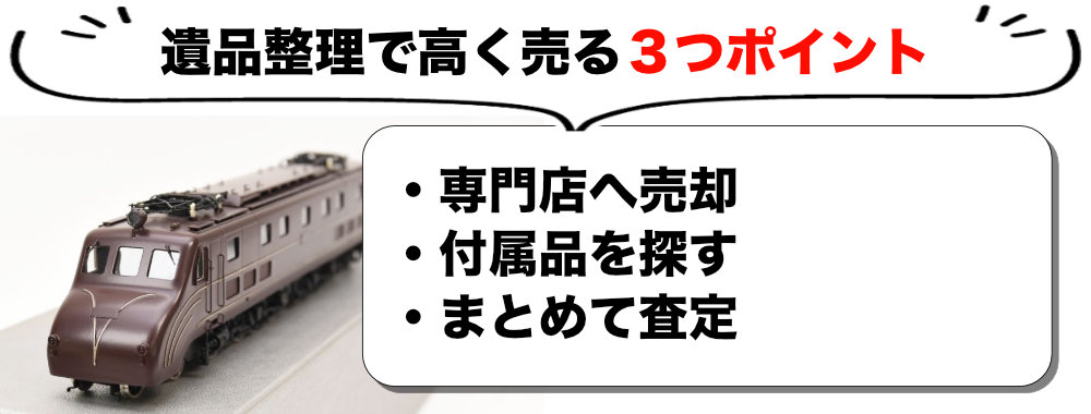 父が他界し、遺品整理をしていたところ、押し入れから天賞堂の鉄道模型が大量に出てきました。箱に「No.510」と書かれたEF55もあります。父は生前、大切にしていたようですが、私たち家族には鉄道模型の知識がまったくありません。こうした古い鉄道模型は、遺品整理業者に一括で引き取ってもらうべきか、専門店に個別に査定してもらうべきか迷っています。また、他にも50点以上の模型があるのですが、一つ一つ調べて持ち込むのは大変です。何か良い方法はありますか?