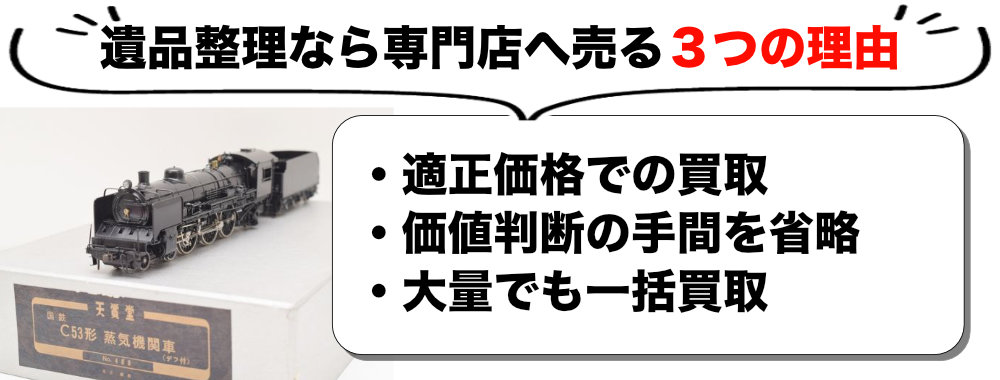 遺品整理では、多くの場合、大量の鉄道模型が一度に出てきます。車両、レール、コントローラー、ストラクチャー、雑誌、カタログ…。「どれに価値があるのか」「型番をどうやって調べればいいのか」と途方に暮れてしまう方も少なくありません。