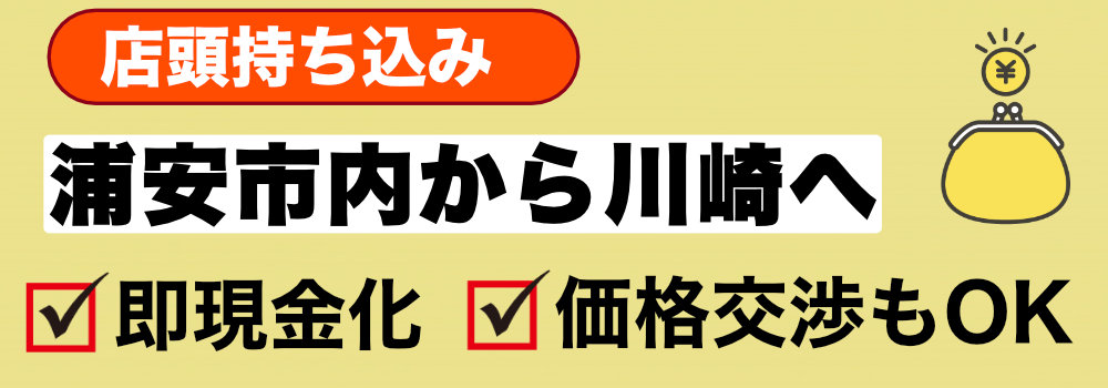 浦安駅から東西線→大手町乗り換え→JRで川崎へ。約1時間の距離です。直接お持ちいただければ、その場で査定・現金払い。「他店と比較したい」という方も大歓迎です。 - ② 出張買取