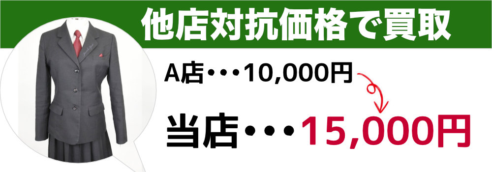 当店では、現実的な買取相場に基づいた誠実な査定を行っています。潤徳女子高校の制服であれば、一般的な使用状態で12,000円〜、状態やセット内容が良好であれば20,000円を超える査定も可能です。