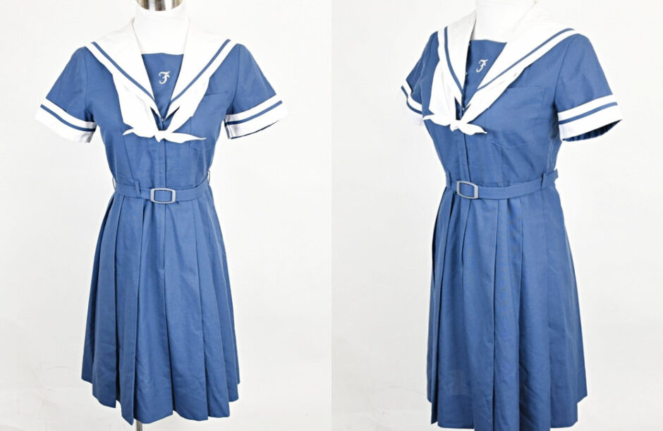 女子の場合、冬服のブレザー・スカート・赤ネクタイに加え、夏服の水色セーラー型ワンピースと白スカーフが揃っていると高評価です。この水色セーラー服は映画やテレビで採用された実績があり、単品でも需要が高いアイテムです。男子の場合は、詰襟の冬服とFマークが入った白シャツの夏服が基本セットとなります。