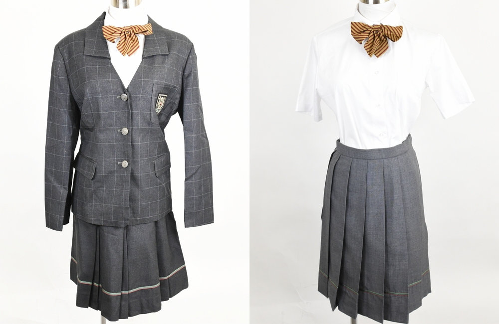 一方、旧制服(〜2012年度)は、ファッションデザイナー阿部兼章氏がデザインした個性的な制服で、吊りタイプのスカート、スカート後ろにマジックテープで止めるリボン、緑のベストなどが特徴です。良質な生地と縫製で知られ、コレクション需要も高い制服です。