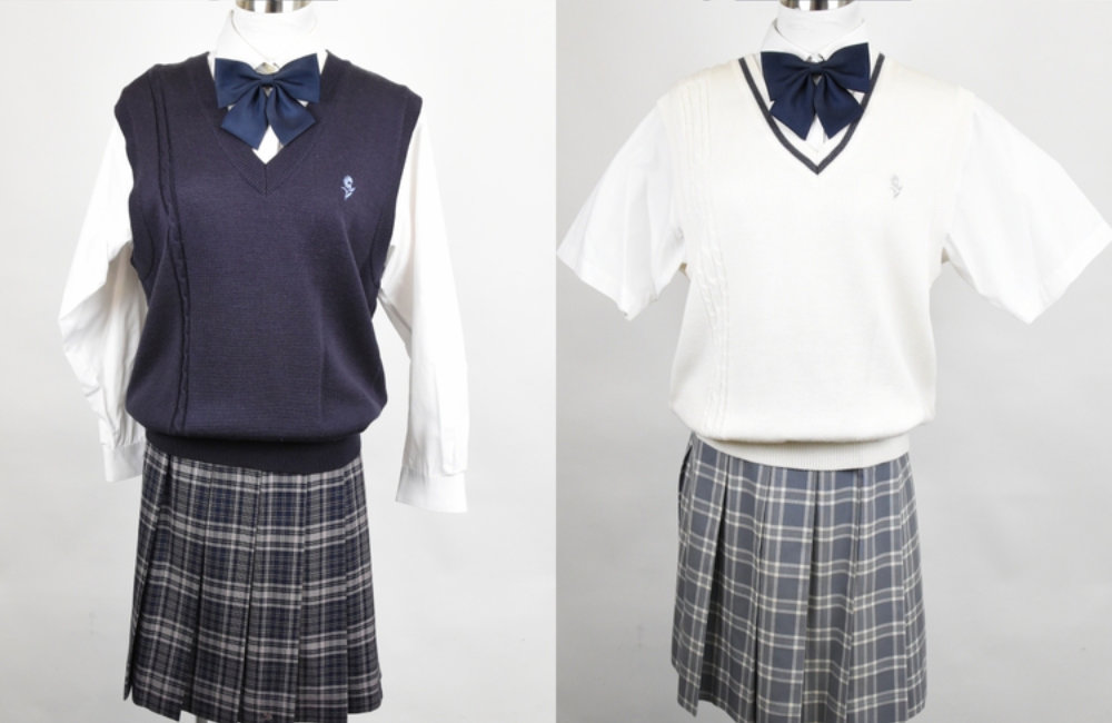 ブレザーはウエストを絞った女性らしいシルエットで、裾がやや斜めにカットされた独特のデザインが特徴。スカートはネイビープリーツ(正装用)とグレー×白チェックプリーツ(通常着用)の2種類があり、シーンや気分に合わせて選べます。アウターはネイビーカーディガン・ネイビーベスト・白カーディガン・白ベストの4種類が用意されており、気温や体調に合わせた細やかなコーディネートが可能です。