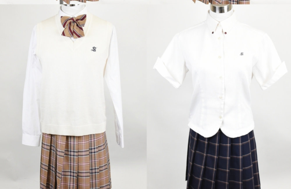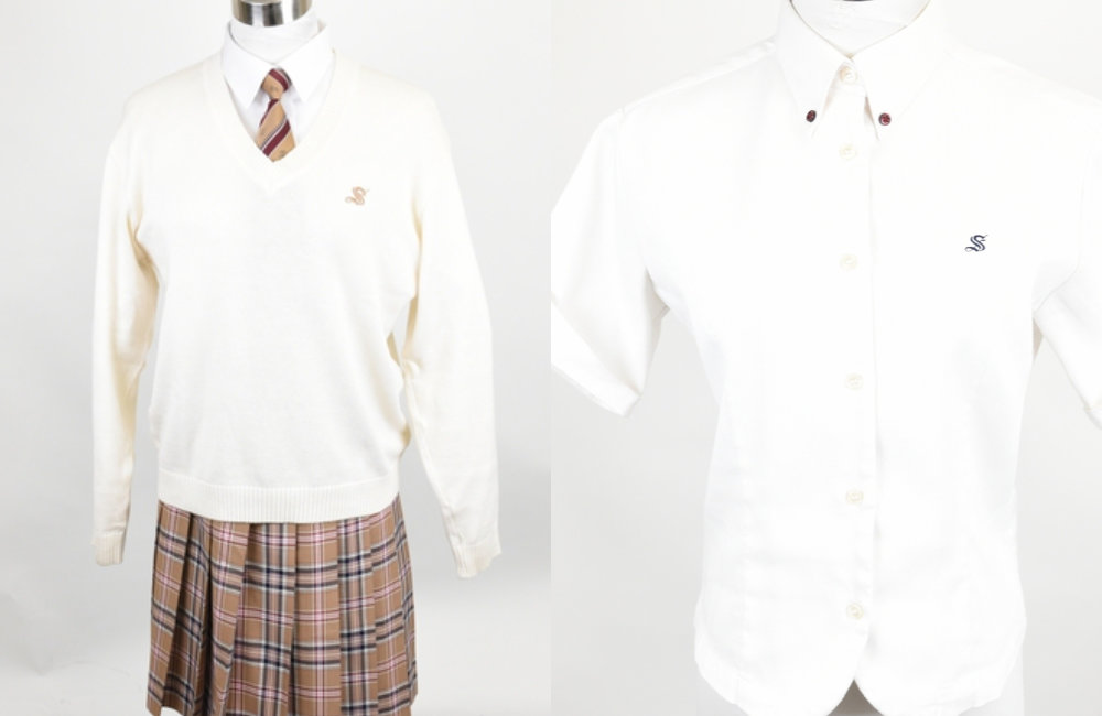 白の半袖ブラウス(胸に小さなSマーク刺繍)に、ネイビー主体のチェック柄プリーツスカートを合わせます。冬スカートの暖色系とは対照的なクールトーンで、季節ごとにまったく異なる印象を与えるデザインになっています。冬物と夏物、両方をセットでお売りいただくと、それぞれの需要に対応できる分だけ査定額が高くなります。