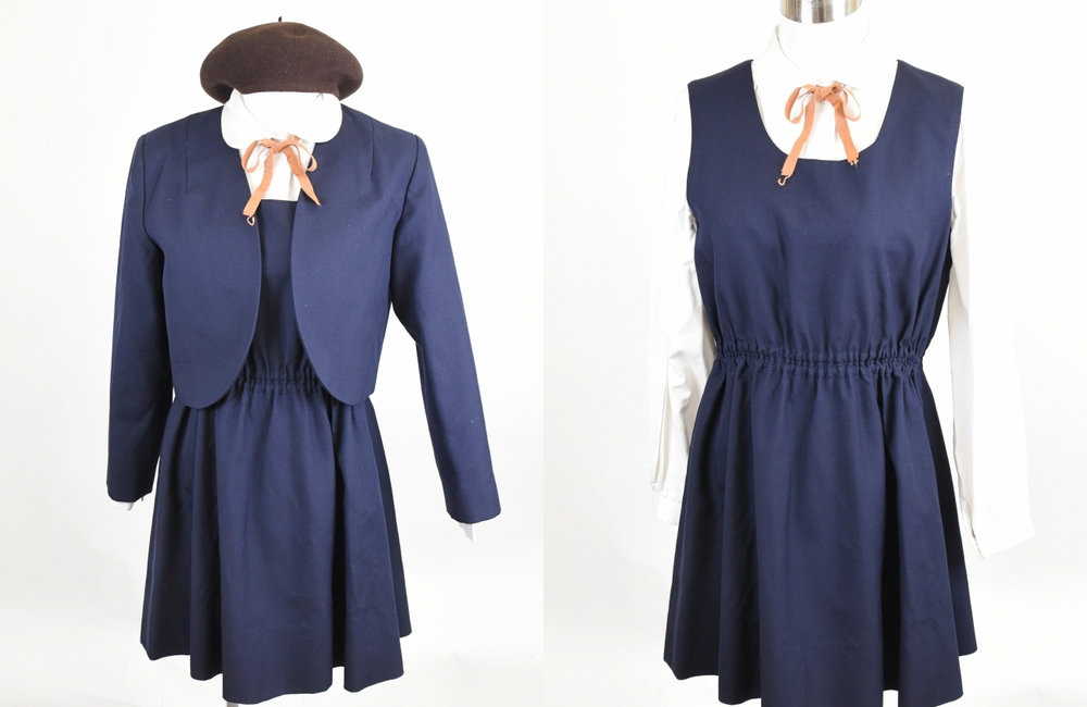 写真でご確認いただけるとおり、聖霊の冬服は濃紺のショートボレロジャケット・同色ジャンパースカート・白長袖ブラウス・ブラウンオレンジのリボンという組み合わせで構成されています。ウエスト部分のギャザー切り替えによってスカートがAラインに広がるシルエットは、現代のブレザー系制服にはない独自の優雅さを持っています。