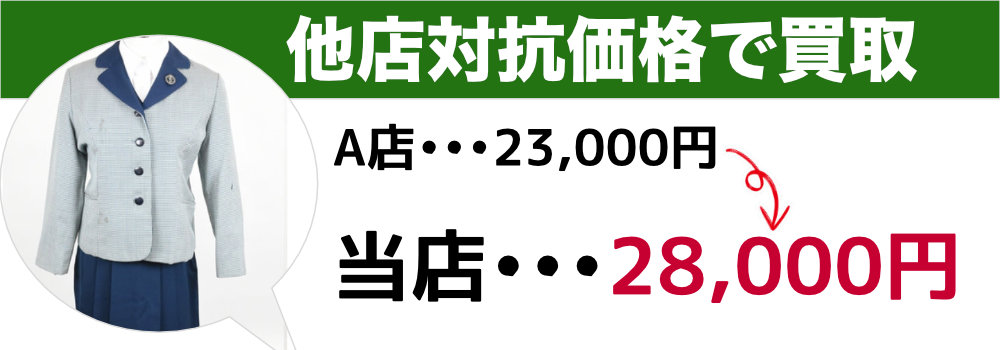 - 3. 在庫リスクを恐れない積極的な買取 一般のリサイクルショップは、売れるかどうかわからない商品の在庫を抱えたくないため、買取を渋ります。しかし制服専門店である当店は、聖心女子学院の制服の需要を熟知しているため、積極的に買取できます。