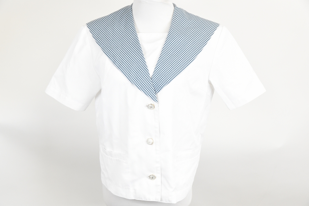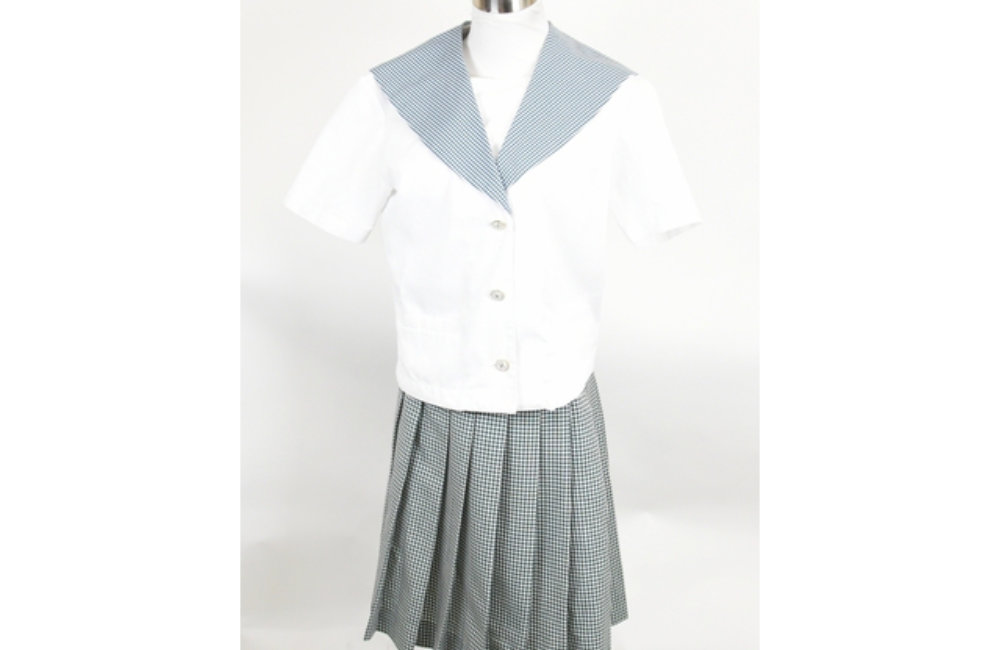 就実高校の制服が他校と一線を画すのは、著名なファッションデザイナーが監修したオリジナルデザインという点です。冬服は白のセーラーカラーが印象的なダブルブレストジャケット、夏服はペパーミントグリーンのギンガムチェックという、ほかにはないオリジナリティの高いデザイン。単なる「学生服」ではなく、ファッションとしての価値を持った制服として広く認識されており、このデザイン性の高さが一般の学校制服とは異なる高い買取価格を支えています。