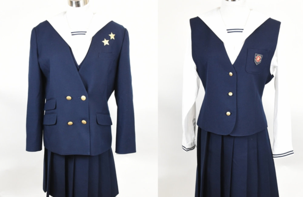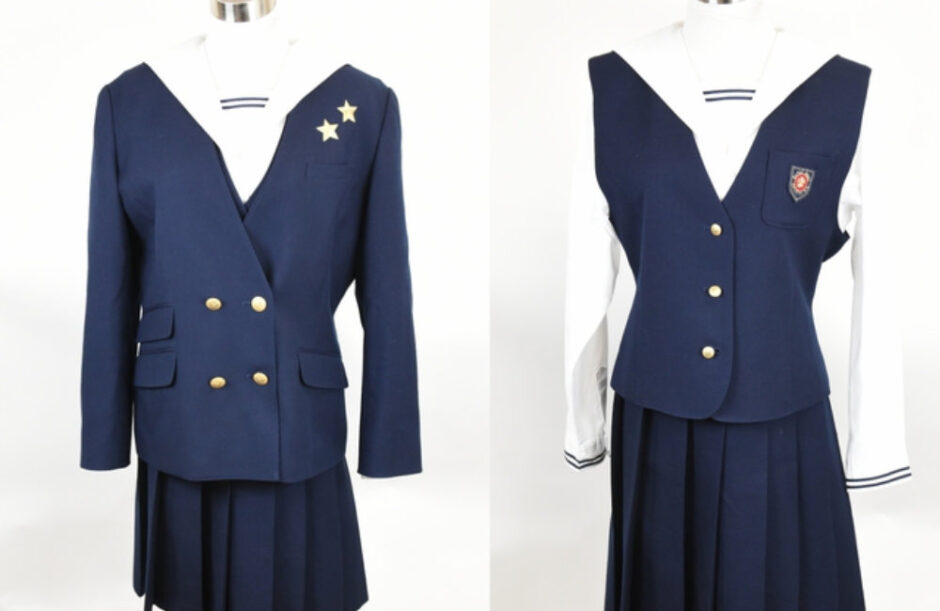 就実高校の制服には「輝く女性に」という願いが込められた2つの星のマークが付いています。このエンブレム部分は制服の顔といえるパーツで、傷みや変色がなければ査定額のプラス評価につながります。保管の際はこの部分を特に丁寧に扱っておくことをおすすめします。