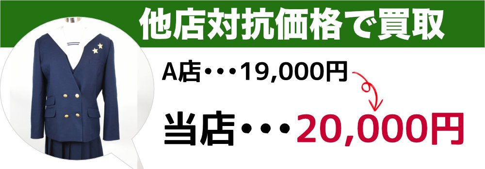 就実高校の制服は、制服専門店のなかでも特に人気が高く、買取依頼が年間を通じて途切れません。当店では、他店の査定結果をお持ちいただいた場合、可能な限り対抗した価格でお買取りいたします。