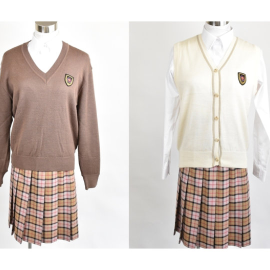 それ以前は、ベージュ系のブレザーとベージュ×ピンク×黒のチェック柄プリーツスカートという、全く異なるデザインの旧制服が使用されていました。当店では、現行制服だけでなく旧制服も買取対象としております。